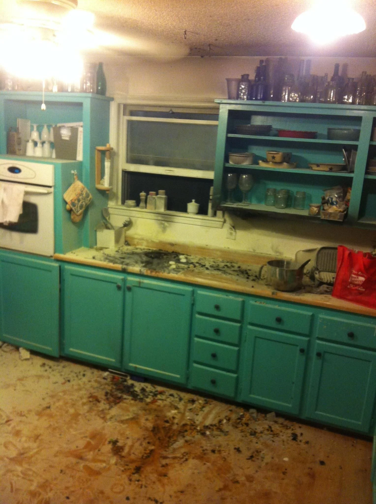 Then in 2012, (after a very questionable teal paint job) I accidentally set the kitchen on fire with an ill-placed bag of groceries on the stovetop while chasing down a toddler outside. Came back, the whole place was filled with smoke and the damage was done.